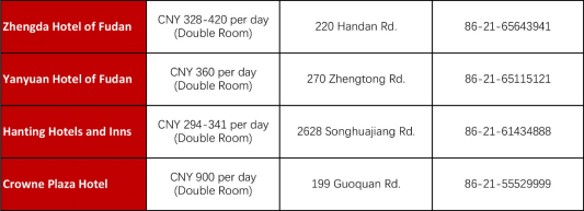 Tongzhou Hotel is a 6-storey building right opposite to the East Gate of Fudan University. The address is 428 Guoding Rd. There are altogether 32 rooms and the room charge of a double room is CNY 200-230 per day. The contact number is 86-21-65110356.