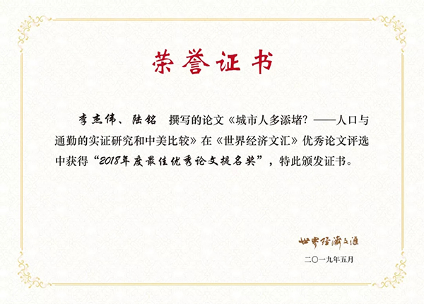 李杰伟、陆铭,城市人多添堵?——人口与通勤的实证研究和中美比较,《世界经济文汇》2018年第6期。