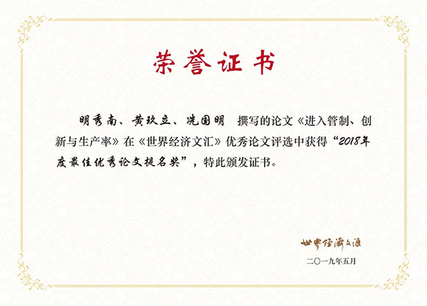 明秀南、黄玖立、冼国明,进入管制、创新与生产率,《世界经济文汇》2018年第1期。