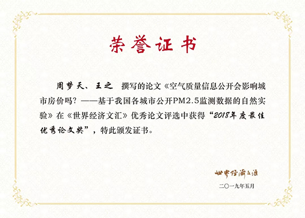 梦天、王之,空气质量信息公开会影响城市房价吗?——基于我国各城市公开PM2.5监测数据的自然实验,《世界经济文汇》2018年第3期。