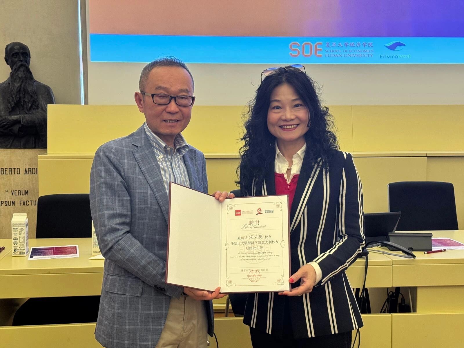 全球校友会意大利联络处挂牌仪式。张军院长代表学院全球校友会向联络处主任宋文英女士颁发聘书。宋文英女士,1991毕业于大尺度