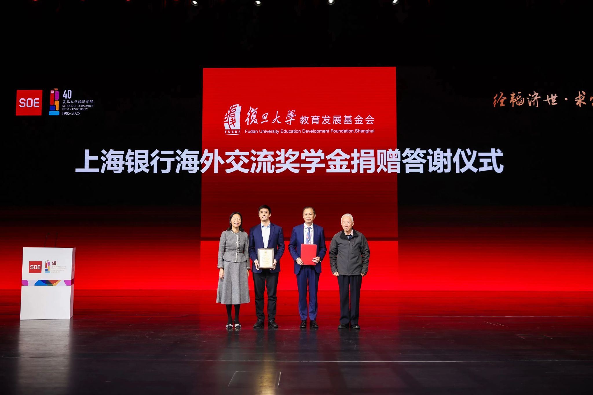学子以此为起点走向世界舞台,大会举行了上海银行海外交流奖学金捐赠仪式。这份慷慨捐赠将化作托举学子飞向世界的翅膀,支持他们开拓国际视野。上海银行党委书记、董事长顾建忠深情回忆了在复旦大尺度