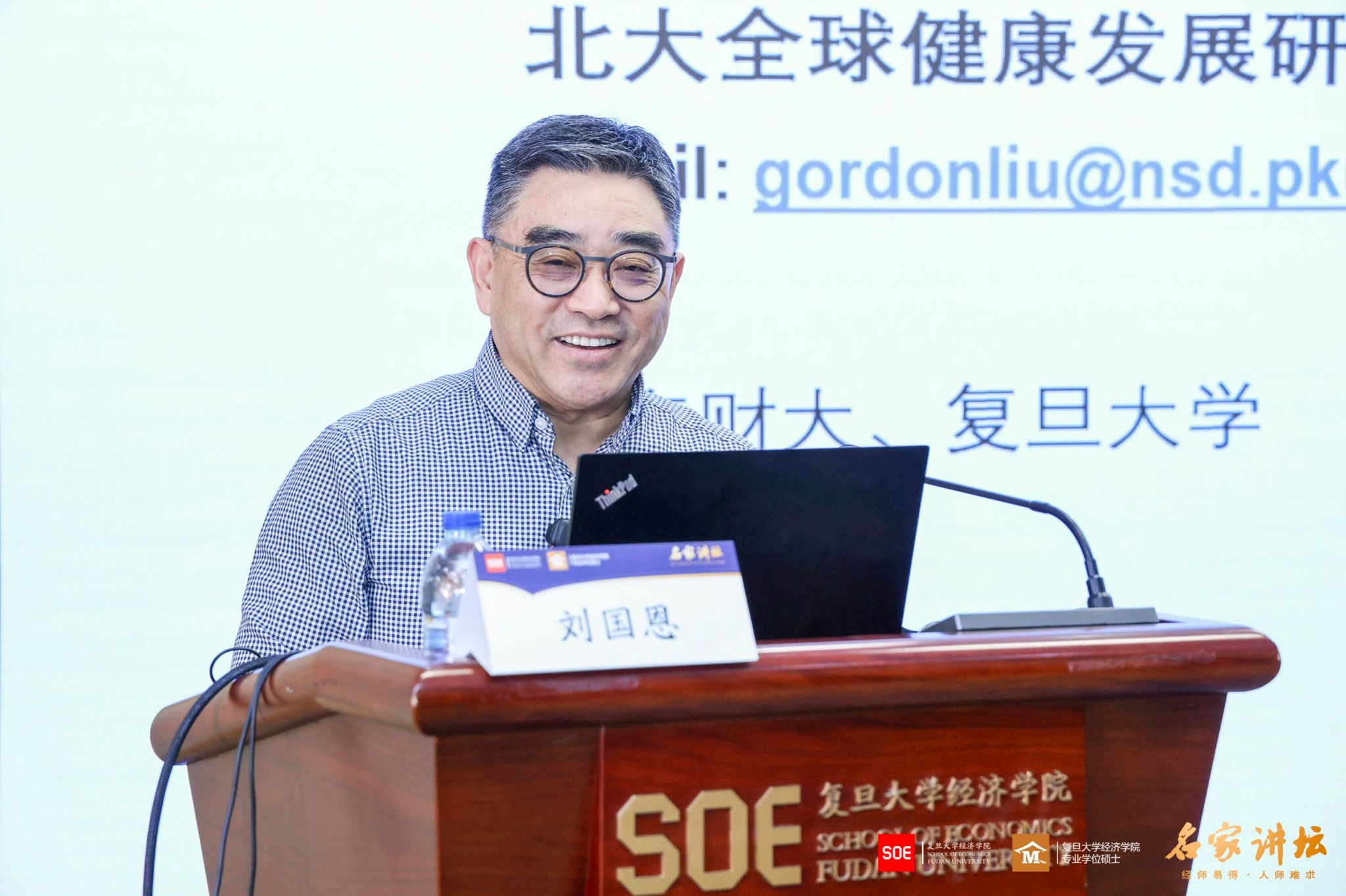 “名家讲坛”第108期、本学期第八次课程在大金报告厅开讲。北京大学全球健康发展研究院院长、北京大学国家发展研究院博雅特聘教授、中国医学科学院学部委员刘国恩教授面对大尺度