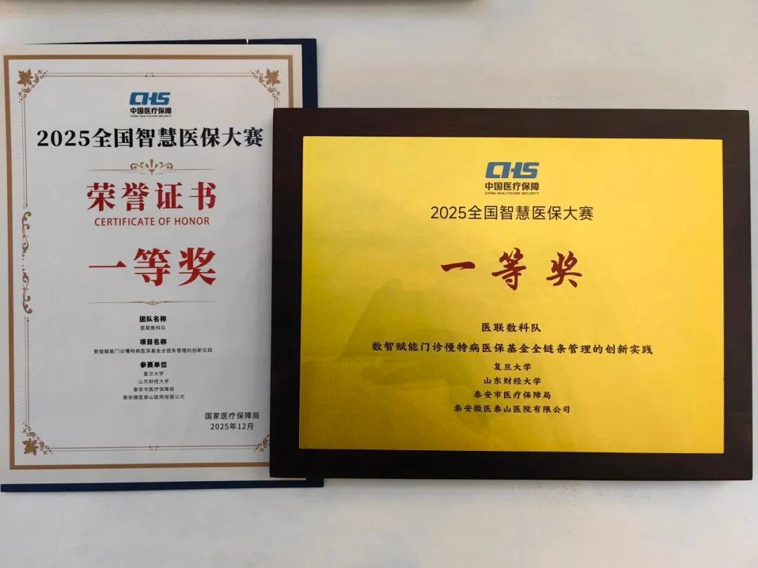 封进教授、王贞副教授领衔,联合泰安市医疗保障局、泰安微医泰山医院、山东财经大学共同组建的“医联数科队”凭借其卓越的创新实践成果,经历初赛、复赛从178个决赛项目中脱颖而出,一举斩获大赛最高奖项——一等奖。