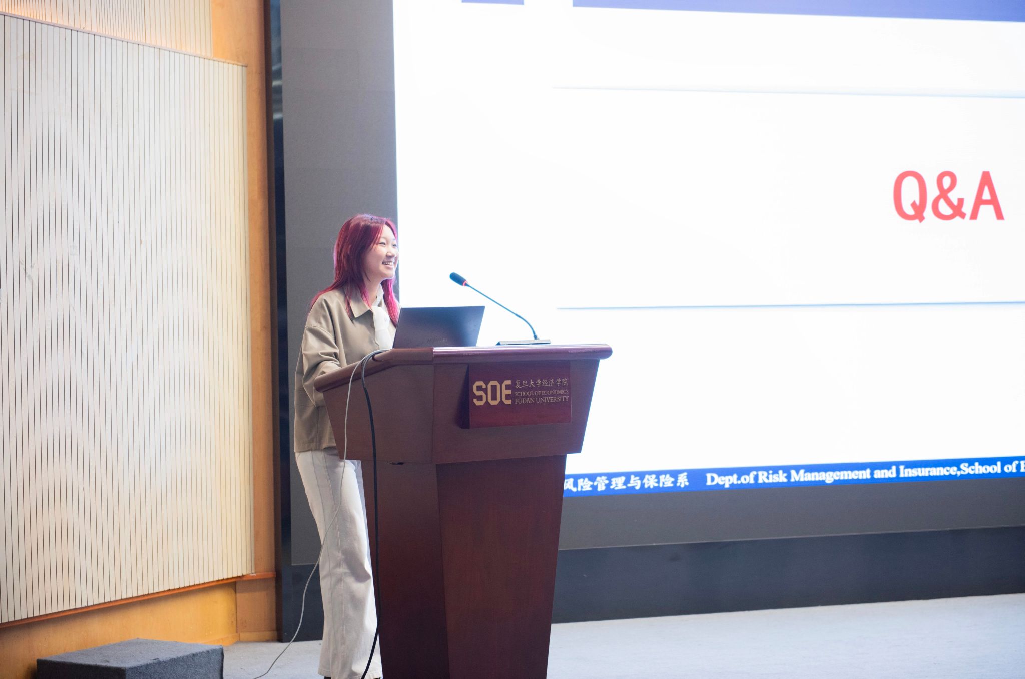 风险管理与保险学系优秀青年教师代表丁晖老师以“在不确定中设计确定:保险学研究的逻辑与温度”为题进行学术分享。如果说课程是骨架,那么学术便是灵魂。丁晖老师从研究者的视角,带领同学们触摸保险学潜藏在冰冷公式背后的温度。世界充满无常,面对命运的掷骰子,保险学能做些什么?丁老师给出了极具力量的回答:在不确定的世界里,寻找确定性的规律;以数理之锚,驯服随机之浪。丁老师以大数法则阐释了个体的随机厄运如何通过群体的互助机制得以化解;以精算定价解析了如何用严谨的数学为不确定性标价,维系市场的生生不息。她引用前沿文献,为同学们揭开保险研究的神秘一角,告诉我们保险学即是以制度之善,抚慰人性之忧,最终落脚点是“人”。