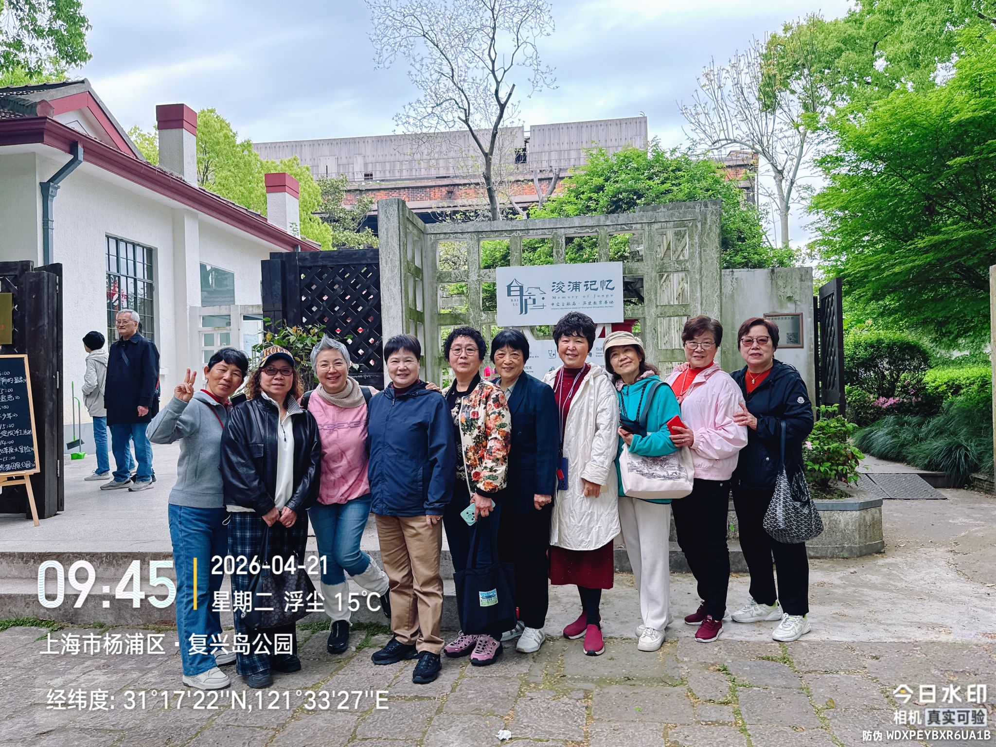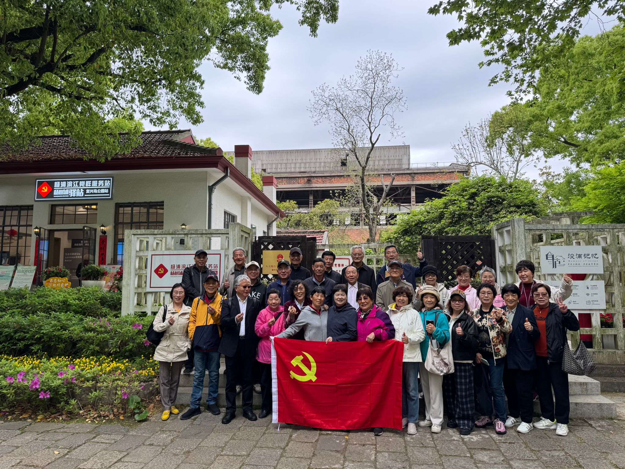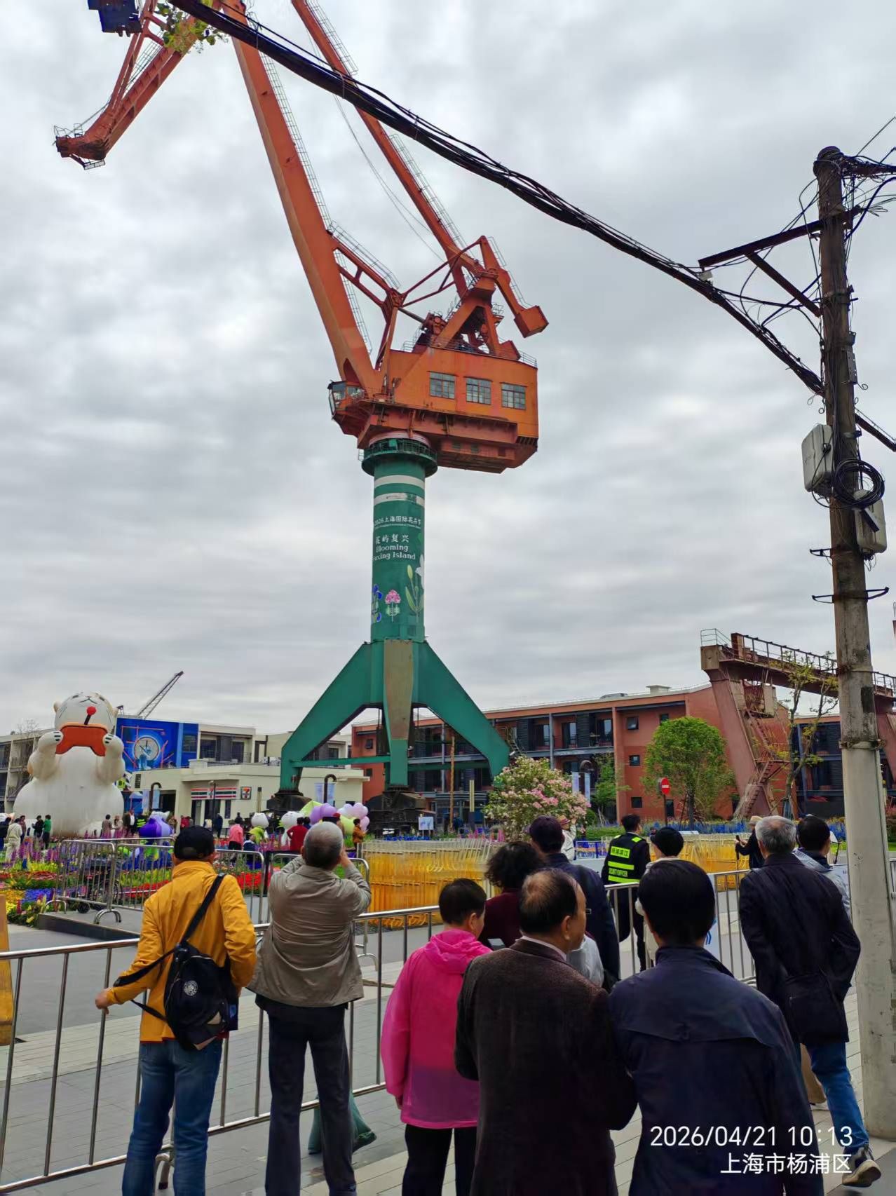 出园后,斜对面的原中华造船厂旧址吸引了大家的目光。这里已改造为2025年正式开放的船台公园,2号、3号船台与二十余座塔吊、龙门架被完整保留。老教师们漫步于枕木铺就的步道,端详齿轮造型的装饰,感受工业遗迹在江风中讲述的岁月故事。恰逢2026上海国际花卉节复兴岛展区在此举办,园内游客络绎不绝,不少家庭带着孩子前来观景拍照,一派生机盎然的景象。