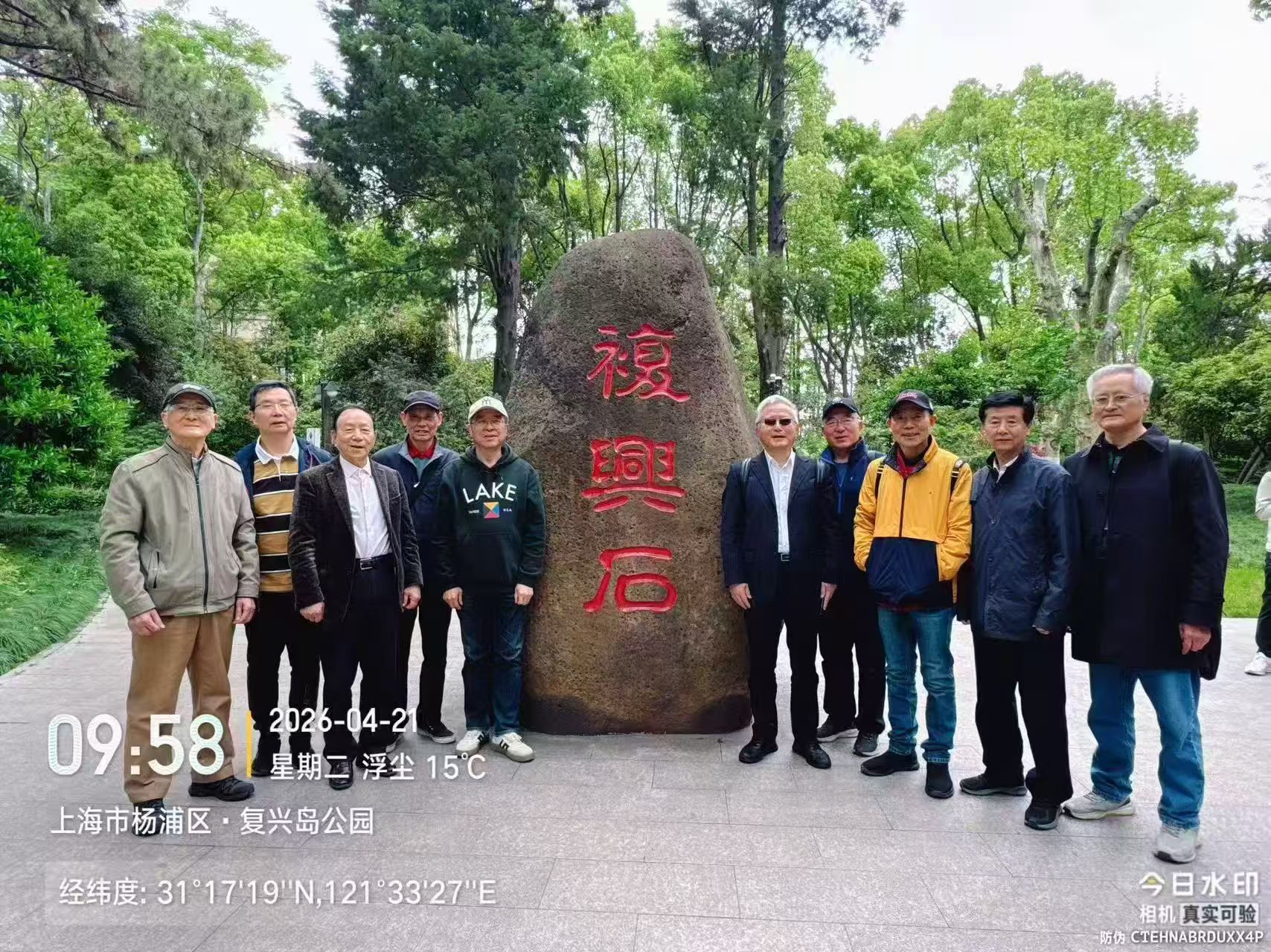 步入复兴岛公园,园内林木深深,绿荫如盖。老教师们了解到,这里上世纪30年代曾是浚浦局体育会花园,抗战期间被日军改建为日式庭园,广植樱花与常绿灌木。园中标志性建筑“白庐”,曾是蒋介石1949年5月离沪前的最后居所,如今已修缮为党群服务站。白墙红顶的建筑四周,百年香樟遮天蔽日。老师们流连于心字湖畔,看落花浮水、日式亭台倒影随风轻漾,在历史的余温与自然的恬淡交融中,体味一份悠然的景致。