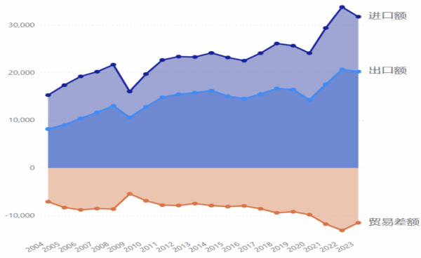 其次,扩大内需必然会相应增加进口。因此,若要进一步降低对出口的依赖,理论上就应降低对净出口(贸易顺差)的依赖。我们需要审视中国贸易顺差的历史性变化,并探讨政策层面如何进行调整以实现其缩减。
