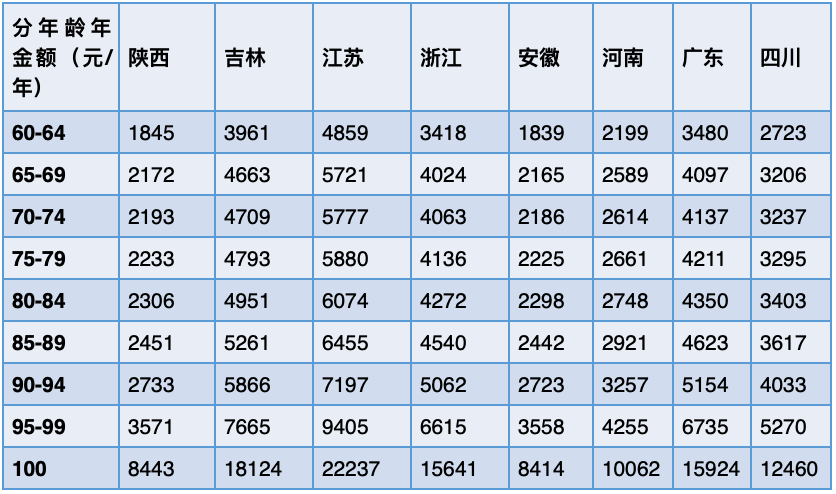 测算结果表明,2025年视同缴费获得的积累折算为年金额,呈现出两个特征(表2),一是年龄越大,补偿越多,因其预期剩余寿命较短,如陕西85-89岁老人年补偿额为2451元,高于60-64岁群体的1845元,但低于100岁以上群体的8443元;二是地区差异显著,这与历史税费负担、农村人均纯收入相关,江苏、浙江、广东等省份补偿额高于中西部省份。