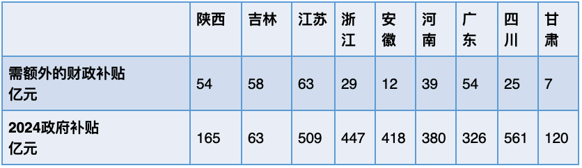 测算表明,2025年各地为落实这一补偿所需的额外财政补贴,与现有财政补贴规模相比,整体压力可控,只有吉林、陕西需额外补贴58亿元、54亿元,财政压力相对较大,其他省份,包括江苏、安徽、四川、甘肃、安徽、浙江、河南等省份新增补贴占现有政府补贴的比重极低,新增财政负担不大,甚至部分省份如甘肃、安徽、浙江、河南,还可在现有基础上继续提高补偿标准,进一步提升养老金充足度。这充分说明,当前我国财政对居民养老的补贴仍有上升空间,为居民养老保险待遇提升提供了坚实的物质支撑。