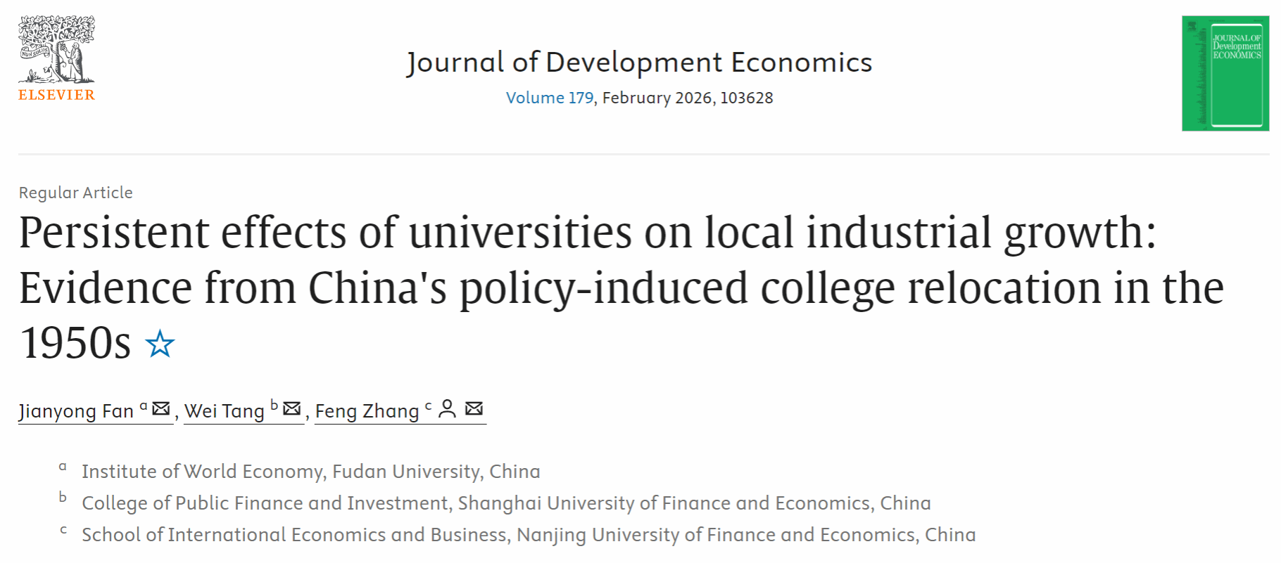 教师范剑勇与两位合作者完成的论文“Persistent Effects of Universities on Local Industrial Growth: Evidence from China’s Policy-induced College Relocation in the 1950s”在经济学国际顶级期刊 Journal of Development Economics 在线发表。