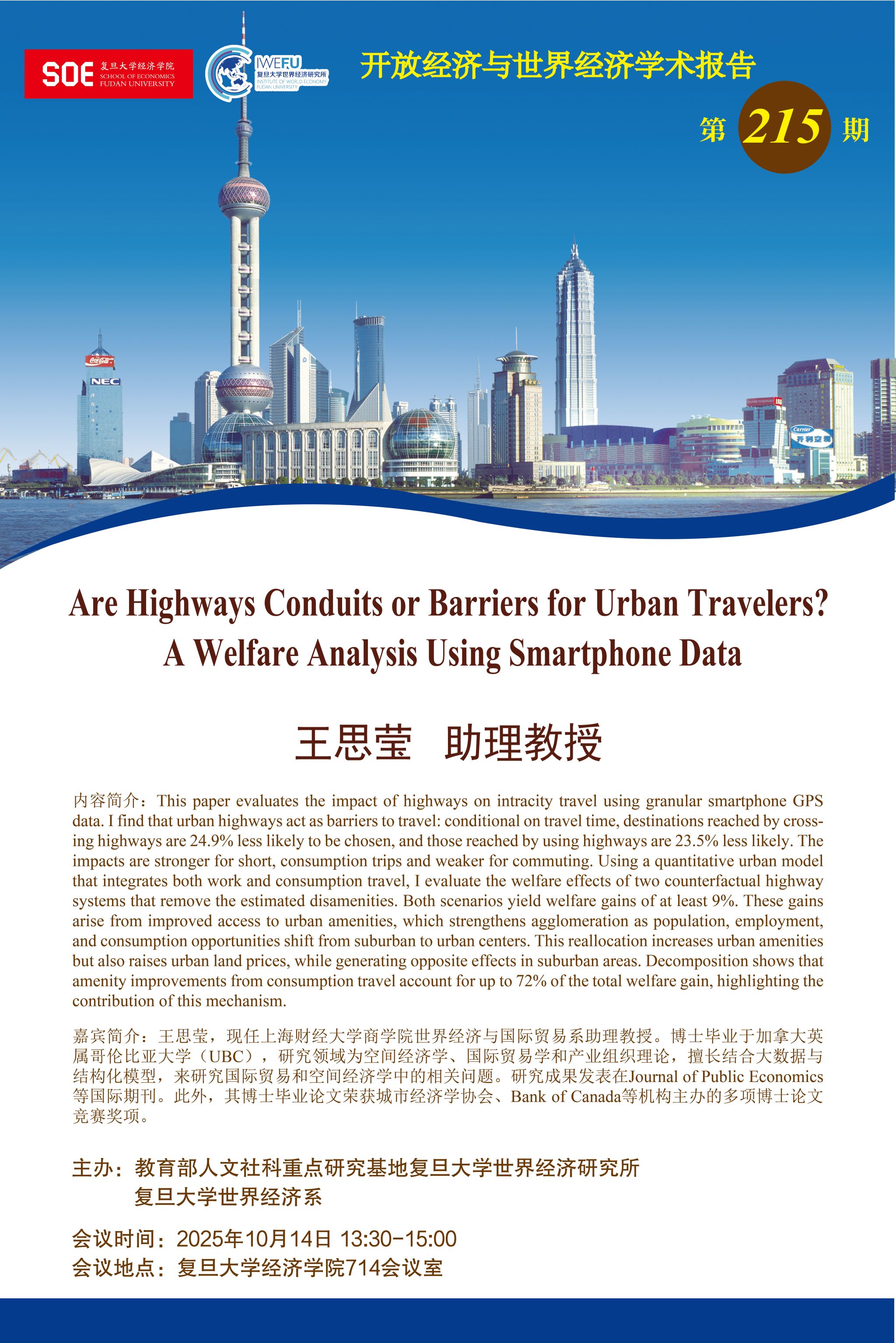 大尺度 世界经济研究所开放经济与世界经济学术报告第215期:Are Highways Conduits or Barriers for Urban Travelers? A Welfare Analysis Using Smartphone Data