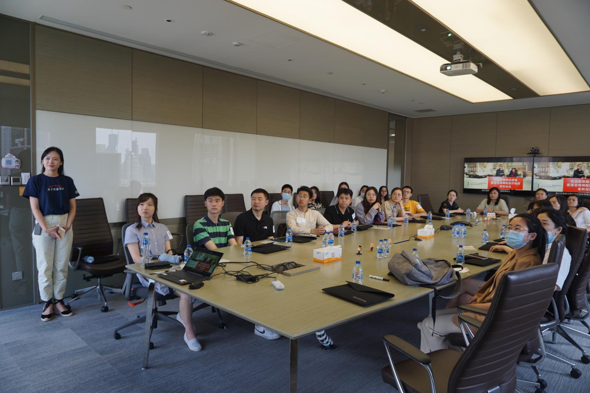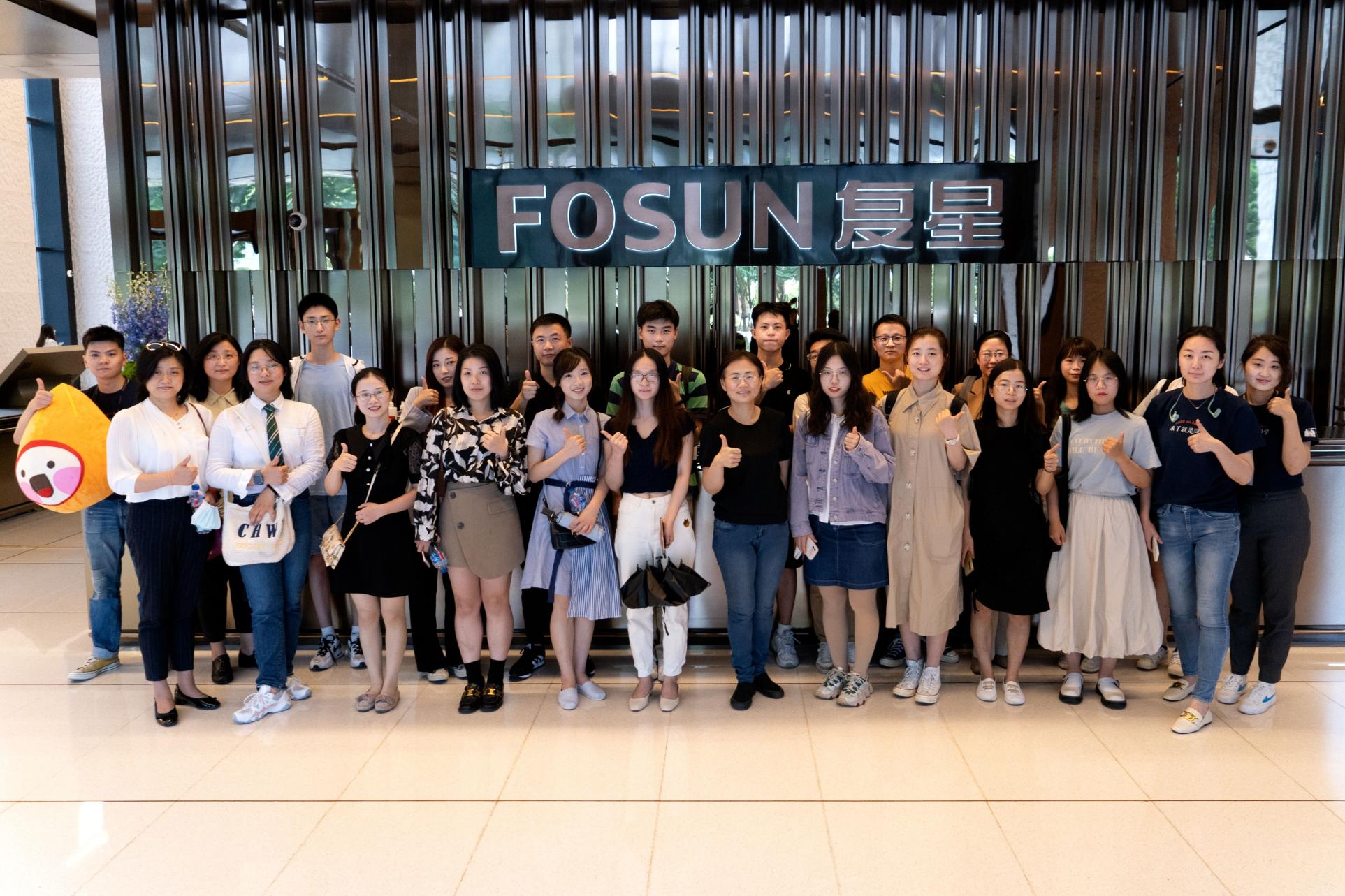 国际商务硕士项目主任蔡晓月副教授、专业学位研究生教务办公室孙冷梅、程惟尔、向韵老师,带领学院20多名专业学位研究生走进位于BFC外滩金融中心的复星,体验福布斯全球500强企业的文化和魅力。