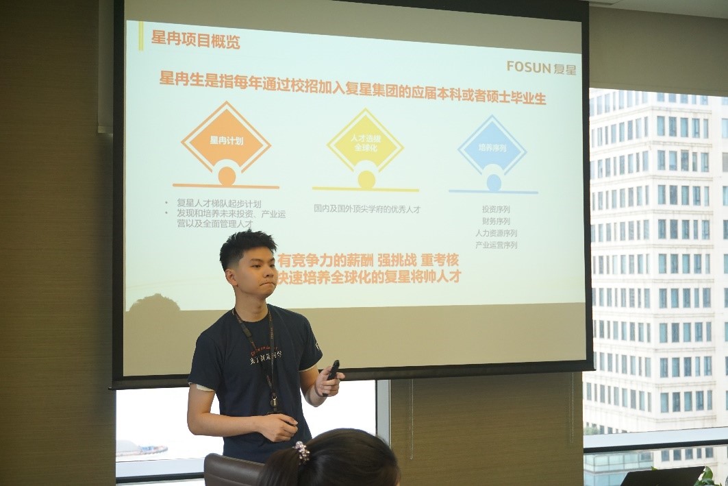 复星学堂星冉生陶亮介绍了复星的星冉计划和人才培养体系。陶亮表示,星冉生是每年通过校招加入复星的应届本科或者硕士毕业生,复星重视人才培养,能够提供行业内有竞争力的机会和平台。同时,陶亮欢迎在座的复旦有志青年能够加入复星,通过自身努力拼搏,实现个人的快速提升。
