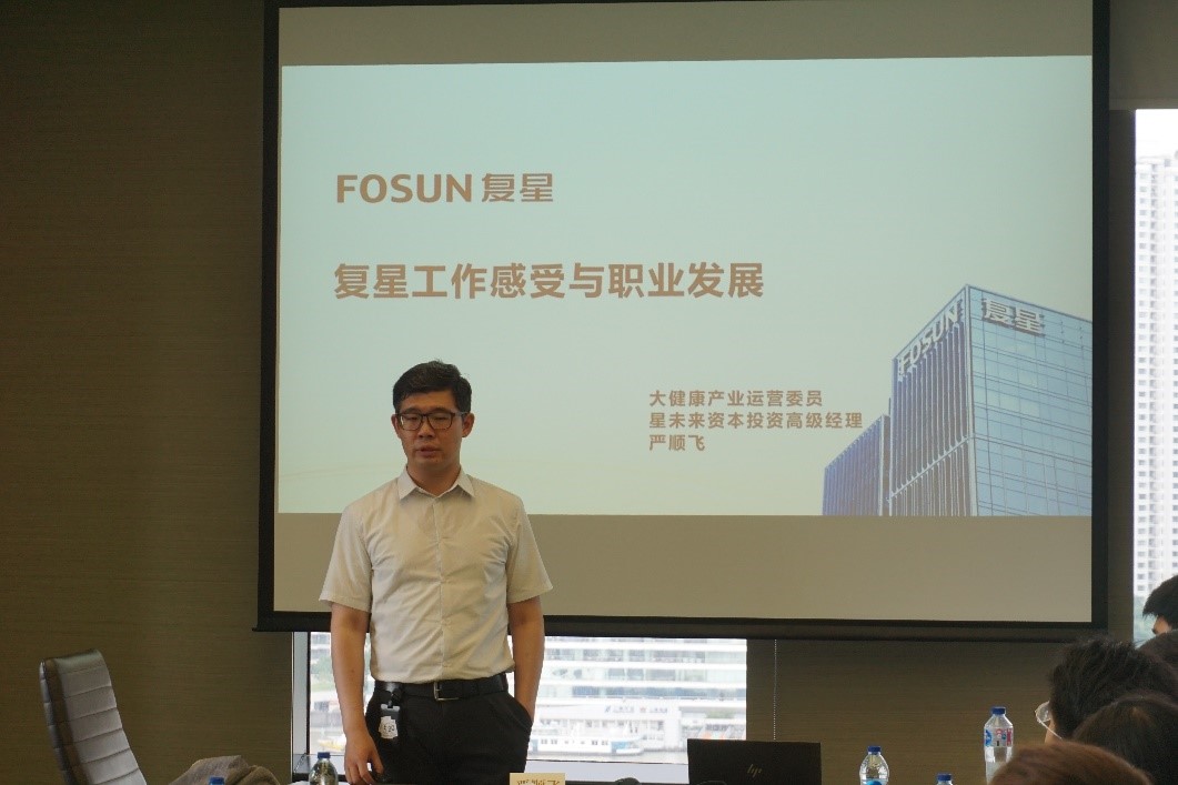 复星大健康产业运营委员、星未来资本投资高级经理严顺飞讲述了他在复星的工作感受与职业发展建议。从严顺飞的讲解中,师生了解到复星在其重点布局的赛道上一直在持续深耕,在投资业务中始终将专业化放在首位,在人才选拔和人才任用上力求“用专业的人做专业的事”。严顺飞建议同学们要多学习多思考,力求丰富自身的深度专业知识储备和跨行业知识储备,做一个复合型人才。