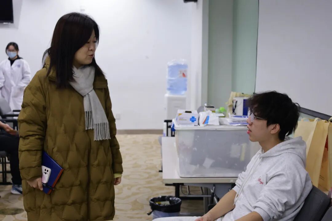 党委副书记张馨老师和学院辅导员们也来到了献血现场,向献血学生表示了亲切关心与慰问。老师们关心着每一位同学的身体情况,高度赞扬了同学们挺身而出的勇气和乐于奉献的精神,温暖的叮嘱与诚挚的肯定在师生之间缓缓流淌。