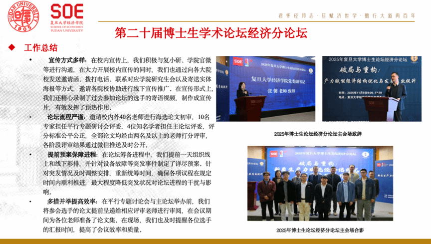 以第二十届博士生学术论坛经济分论坛为核心,深化品牌建设。本届论坛共收到来自全国高校的投稿221篇,数量与质量均创新高。通过深化跨校合作、严格评审流程、强化宣传预热及制定完备预案,确保了论坛各环节的高质量实施,学术影响力持续扩大。