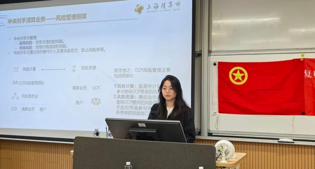 上海清算所杜雪菲和许桥宇老师介绍了上海清算所的核心业务,即集中清算、债券发行登记托管结算,通过规范的会员准入与完备的风险防控体系,有效降低市场信用风险与资本占用,现场同学们的笔记本上记满了“CCP”“风险准备金”等实务要点。
